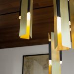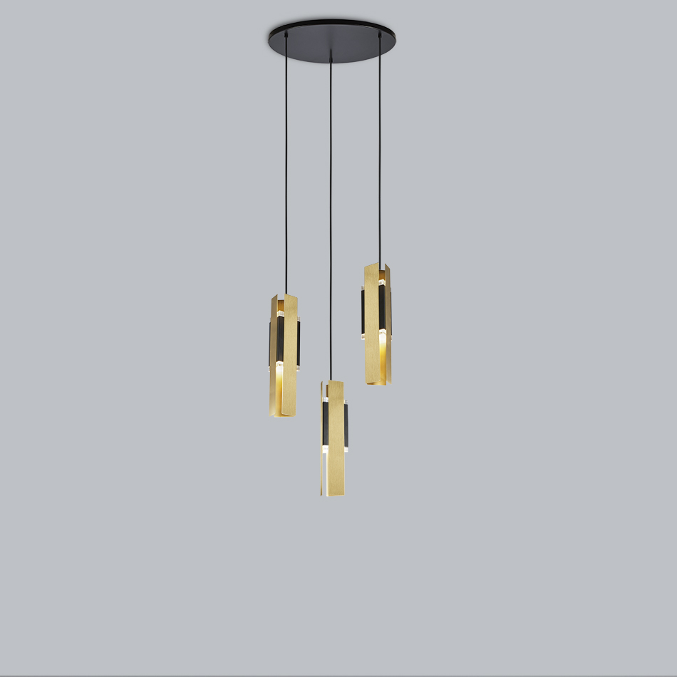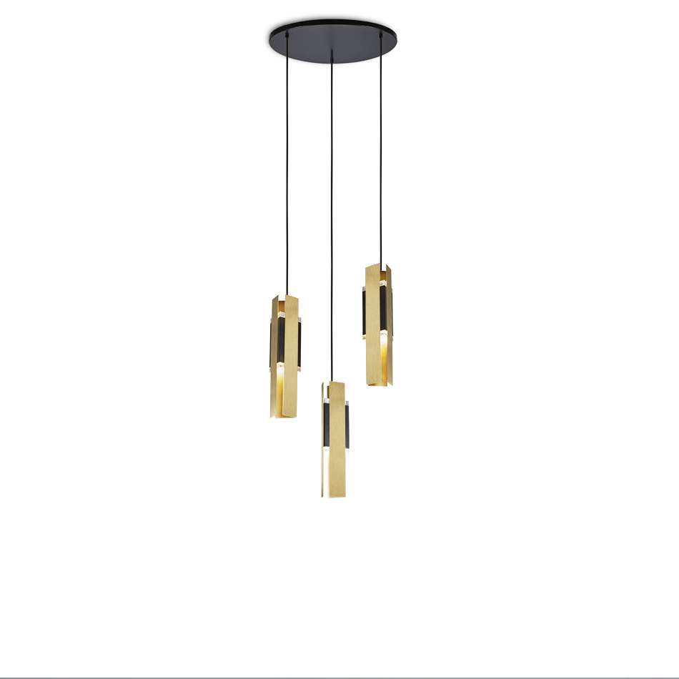 A slightly Deco-inspired lamp. The main body is in black coating and the light is spread through two plexiglass prisms and it’s wrapped into three rectangular brushed brass foils. It is available in different compositions: single or bunch