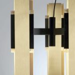 A slightly Deco-inspired lamp. The main body is in black coating and the light is spread through two plexiglass prisms and it’s wrapped into three rectangular brushed brass foils. It is available in different compositions: single or bunch