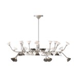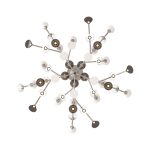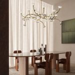 so sinuous and elegant as to evoke the veins that run through the leaves, with bright points of light that shine like dew drops. In this family, made up of pendants, floor, table lamps, and wall sconces, the refined branches are available in gold, titanium or matt nickel finishes, while the light sources, made of Murano glass, are available in smoky and transparent finishes or milky white.