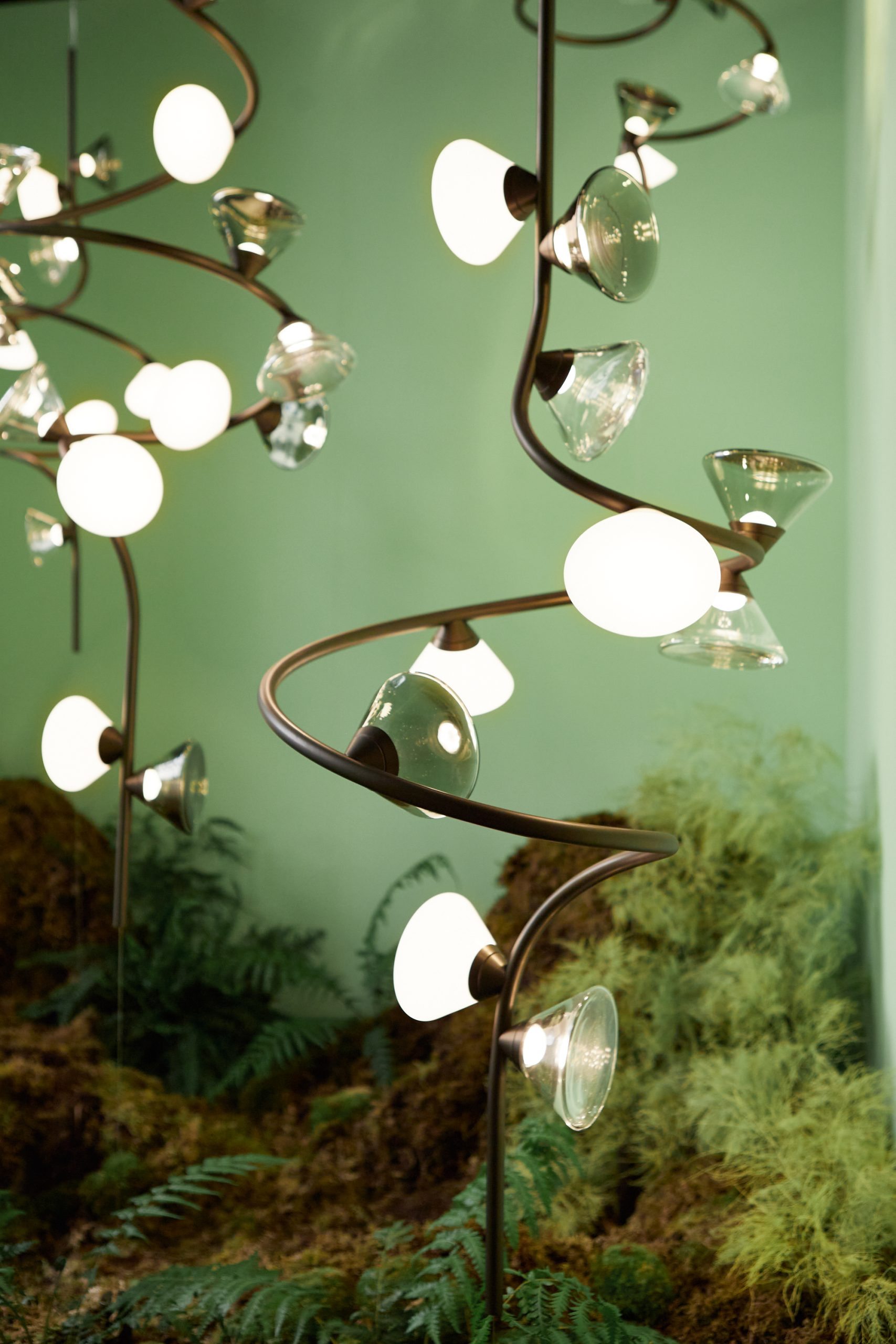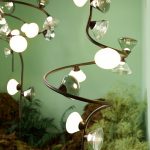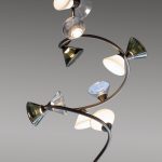 so sinuous and elegant as to evoke the veins that run through the leaves, with bright points of light that shine like dew drops. In this family, made up of pendants, floor, table lamps, and wall sconces, the refined branches are available in gold, titanium or matt nickel finishes, while the light sources, made of Murano glass, are available in smoky and transparent finishes or milky white.