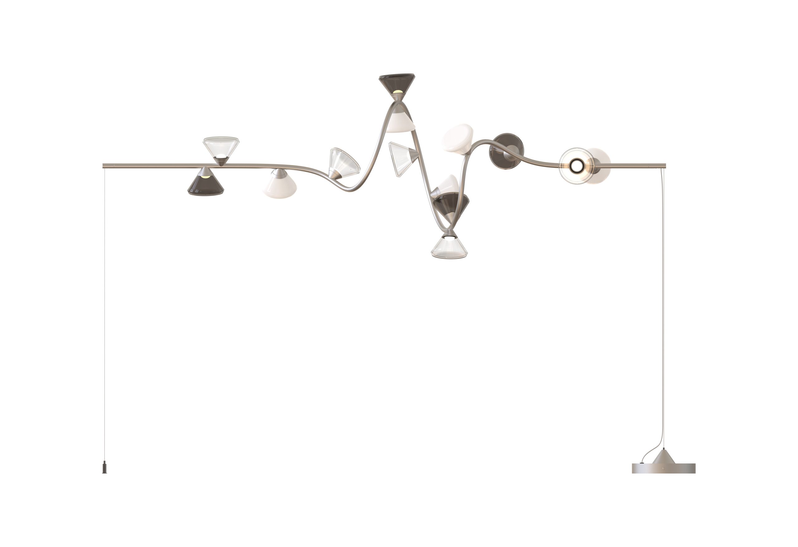 so sinuous and elegant as to evoke the veins that run through the leaves, with bright points of light that shine like dew drops. In this family, made up of pendants, floor, table lamps, and wall sconces, the refined branches are available in gold, titanium or matt nickel finishes, while the light sources, made of Murano glass, are available in smoky and transparent finishes or milky white.